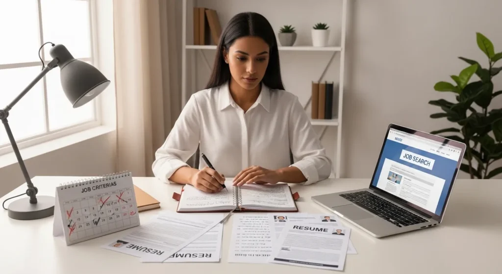 Imagem retrata uma profissional revisando anotações, calendário e materiais de candidatura para manter critérios claros na busca por oportunidades, em um ambiente organizado e realista de trabalho.