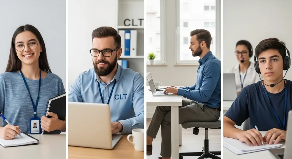 Imagem mostra diferentes perfis profissionais em contextos de trabalho que representam estágio, CLT, PJ, contrato temporário e jovem aprendiz, destacando como cada modelo de contratação se encaixa em rotinas e momentos de carreira distintos.