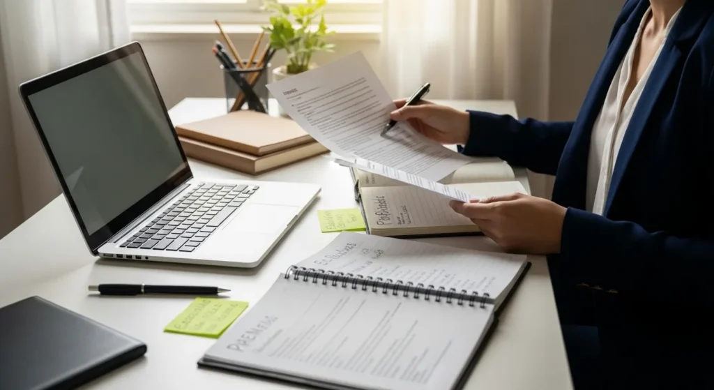 Por fim, organize a parte operacional. Horário, roupa adequada ao contexto, local da entrevista, conexão de internet, documento, currículo atualizado e ambiente silencioso fazem diferença porque reduzem estresse desnecessário antes da conversa.