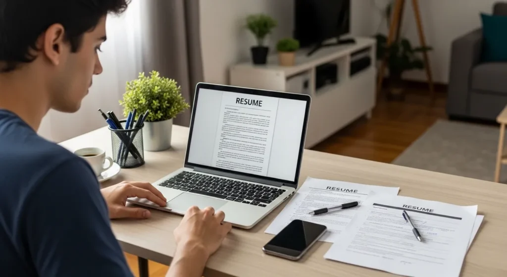 A imagem mostra um estudante em um momento de revisão cuidadosa do currículo antes do envio. O notebook aberto, as folhas com anotações e o ambiente organizado ajudam a transmitir atenção, responsabilidade e preocupação com a qualidade final do documento.