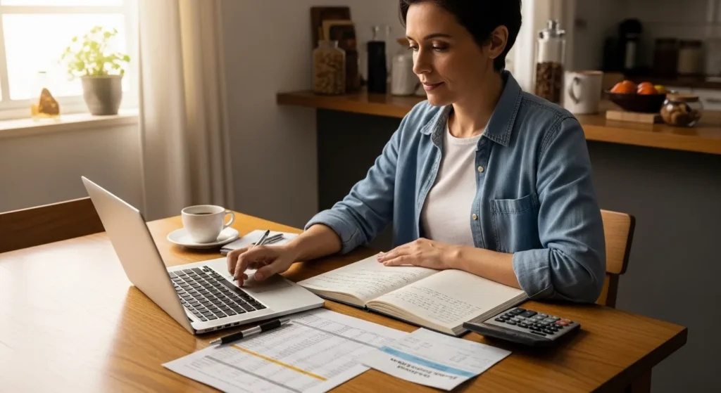 Pessoa organiza contas, anotações e planilhas sobre a mesa enquanto avalia o orçamento antes de mudar de carreira.