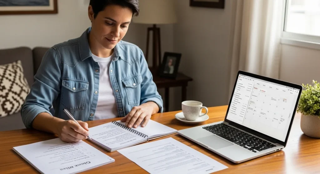 Pessoa revisa anotações, checklist e rotina de trabalho em uma mesa organizada, representando o cuidado contínuo após o início de uma nova etapa profissional.