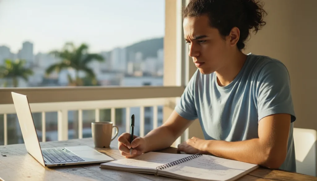 A imagem retrata um jovem concentrado enquanto organiza informações para montar um currículo no notebook. Sobre a mesa há um caderno aberto com anotações e uma caneta, sugerindo que a pessoa está estruturando ideias antes de escrever.