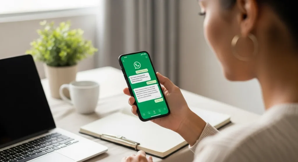 O WhatsApp pede naturalidade, mas sem excesso de intimidade. A pessoa pode copiar, ajustar o nome da empresa e enviar em horário comercial.